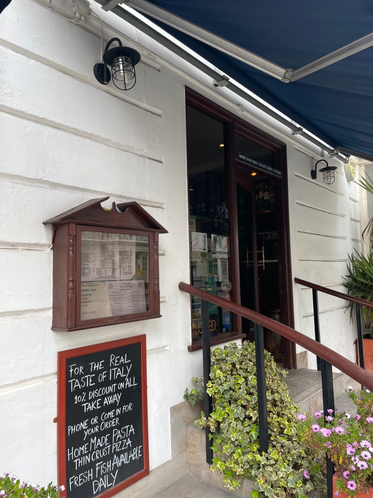 In town to see the birthplace of an ancestor and with a filthy hangover from watch The Agèd Damnèd the night before I felt I couldn’t visit Pimlico without paying homage to the great Alexandra (who died in 20212 alas) in her neighbourhood restaurant of choice, O’Sole Mio. I hadn’t been there since she was alive and felt a twinge of betrayal at visiting without Denize but hell, I thought, it might not even be running.